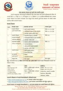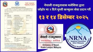 नेपाली राजदूतावास, क्वालालम्पुरले २०८२ मंसिर २७–२८ (१३–१४ डिसेम्बर २०२५) का दिन जोहर बाहरुमा राहदानी नविकरण र राहदानी वितरण लगाएतका सेवाहरू प्रदान गर्न घुम्ती कन्सुलर सेवा संचालन गर्ने भएको छ ।