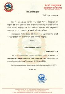क्वालालम्पुर, मलेसिया — नेपाली राजदूतावास, क्वालालम्पुरले चाइनिज नयाँ वर्षको अवसरमा एक दिनका लागि सार्वजनिक विदा रहने सूचना जारी गरेको छ।
